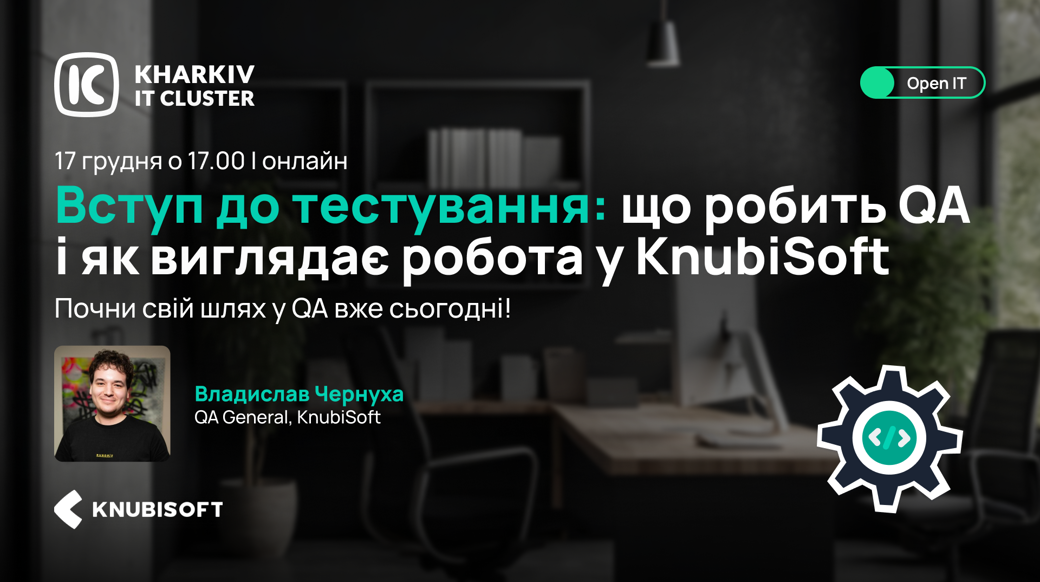 Kharkiv IT Cluster запрошує на останній вебінар в цьому семестрі в межах проєкту Open IT від компанії KnubiSoft для всіх, хто хоче зрозуміти, що таке QA, які задачі виконують тестувальники та як організована їхня робота в ІТ-компанії.