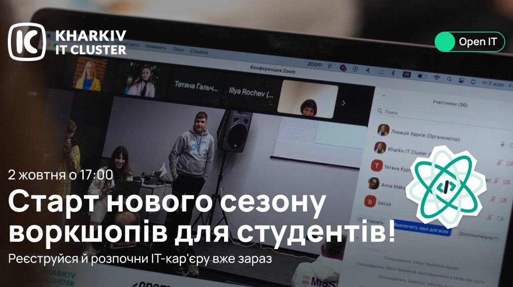 Open IT — освітній openspace-проєкт від Kharkiv IT Cluster, де ти можеш долучитися до безоплатних навчальних воркшопів від найкращих IT-фахівців України.Що чекає тебе на Open IT у цьому сезоні?