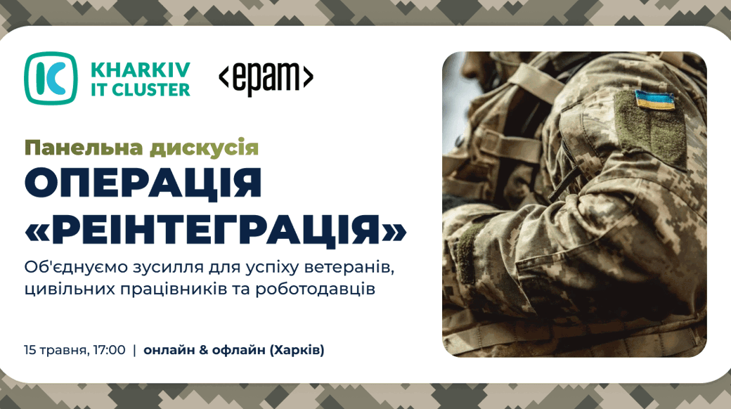 Навіть зараз не всі громадяни усвідомлюють реалії повернення ветеранів і ветеранок до цивільного життя. Водночас сьогодні Україна має в лавах збройних сил сотні тисяч громадян. Вони мають розраховувати на роботу після повернення — за попереднім фахом або в цілком новій для себе галузі. Саме тому для відповідального бізнесу й суспільства загалом підтримка ветеранів і ветеранок стає невід'ємною частиною повсякденного життя. Цивільні сфери мають забезпечити всі можливі засоби для успішної реінтеграції та адаптації захисників і подальшого життя поза фронтом. Це сприятиме розвитку й розбудові нового, сталого, потужного, інклюзивного українського суспільства. Але як це зробити на практиці? Якими мають бути відповідні програми, щоб працювати в реальності, а не лише існувати на папері? Kharkiv IT Cluster спільно з ІТ-компанією EPAM Україна зосереджують свої зусилля на активній підтримці ветеранів і ветеранок у їхній адаптації до цивільного життя й роботи. Організації збирають практичні кейси, упроваджують спеціальні програми й діляться власним досвідом реінтеграції захисників. Запрошуємо керівників, HR-спеціалістів, рекрутерів і всіх охочих на панельну дискусію «Операція "Реінтеграція". Як підтримати ветеранів, які повертаються до цивільного життя?». 📆 15 травня, 17:00 📍 offline (у Харкові) та online (в Zoom).Під час дискусії обговоримо: