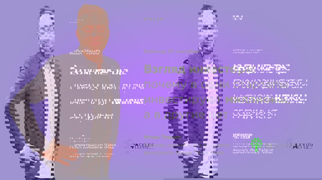 26 вересня, ми з Igor Pertsiya, венчурний партнер найбільшого Українського венчурного фонду TA Ventures (засновник фонду Вікторія Тігіпко) проведемо вебінар. Поговоримо про те, чому фонд інвестує в одні проекти мільйони, а в інші ні. Чого не вистачає іншим стартаперам, як стати привабливим для інвестора, і як відбуваються інвестиційні угоди в технологічні стартапи від А до Я.