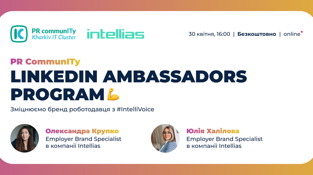 Приєднуйся 30 квітня до івенту PR Community «LinkedIn Ambassadors Program: зміцнюємо бренд роботодавця з #IntelliVoice»!