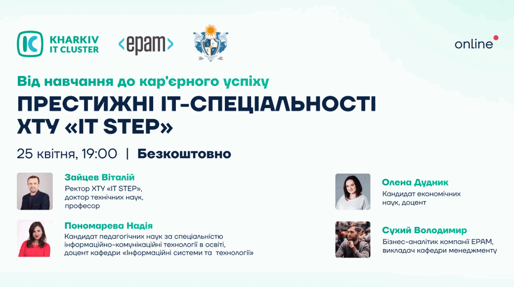 Kharkiv IT Cluster продовжує знайомити абітурієнтів з ІТ-університетами України! Уже 25 квітня запрошуємо на вебінар з Харківським технологічним університетом «IT STEP» на тему: «Престижні IT-спеціальності ХТУ «IT STEP»: від навчання до кар'єрного успіху».