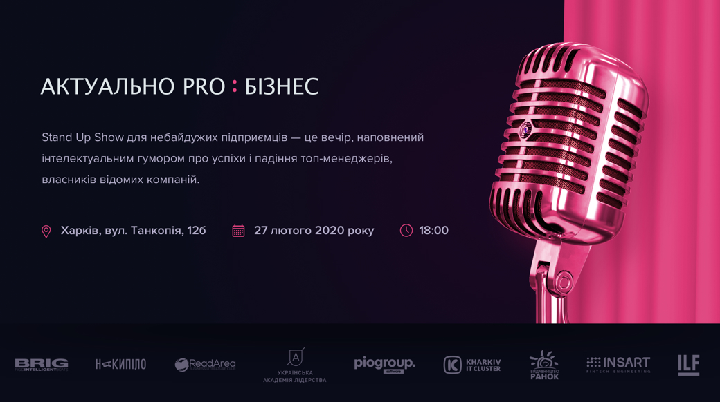 Осередок УАЛ Харків, вул. Танкопія, 12БЗапрошуємо на Stand Up Show для небайдужих підприємців. Це вечір, наповнений інтелектуальним гумором про успіхи і падіння топ-менеджерів, власників відомих компаній. Дата проведення першого з серії івенту: 27 лютого 2020 року. Місце проведення: Осередок УАЛ Харків, вул. Танкопія, 12Б Ведучим заходу буде неймовірний красномовний Майкл Щур. А ділитися своїм досвідом будуть відомі та прогресивні підприємці: Slava Rodionov - співзасновник та директор фірми BRIG Аліна Очеретяна - засновниця та керівниця українського бренду Kachorovska atelier Тетяна Гавриш - керуюча партнерка юридичної компанії ILF, почесна консулка ФРН в м. Харків Александр Колб - засновник маркетингової агенції Promodo Digital Agency, співзасновник та член наглядової ради Kharkiv IT-Cluster Програма: 18.00 - Реєстрація 18:10 - Велкам-кава, екскурсія по осередку УАЛ Харків 19.00 - 20.30 - Виступи спікерів 20.30 - 21.00 - Час корисного нетворкінгу Дрес код: business casual АктУАЛьно pro - це ціннісний майданчик для нетворкінгу, простір для дискусій про сьогодення та майбутнє, культуру та інвестиції, освіту та підприємництво, розбудову громадянського суспільства, національну безпеку та оборону, українську ідентичність та процеси державотворення. Ми зберемо разом представників різних спільнот для налагодження діалогу: Успішних підприємців Харкова Відомих харківських митців Лідерів громадської думки Представників міжнародної спільноти Лідерів асоціацій та кластерів міста Харківський осередок Української Академії Лідерства - це незалежна освітня програма, студенти якої сьогодні - кваліфіковані кадри завтра. Тому ми закликаємо інвестувати в майбутнє. Ми хочемо аби всі наші друзі, партнери, учасники відчули дотичність до спільної дії. УАЛ вже сьогодні здійснює вплив і несе цінність для Харкова - соціальні проекти для громади та виховання майбутніх лідерів держави - ми потребуємо підтримки аби дати ще більшу цінність. Організатори: Осередок Української Академії Лідерства УАЛ Харків спільно з партнерами: Медіа-група Накипело, Компанія INSART Ukraine, Юридична компанія ILF, Компанія BRIG, Компанія Piogroup Software, Видавництво Корпорація "Ранок" , ReadArea Business Literature Club Kharkiv IT cluster