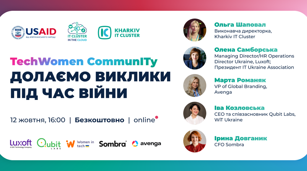 ℹ️ TechWomen CommunITy реалізується Kharkiv IT Cluster за підтримки Програми USAID «Конкурентоспроможна економіка України».