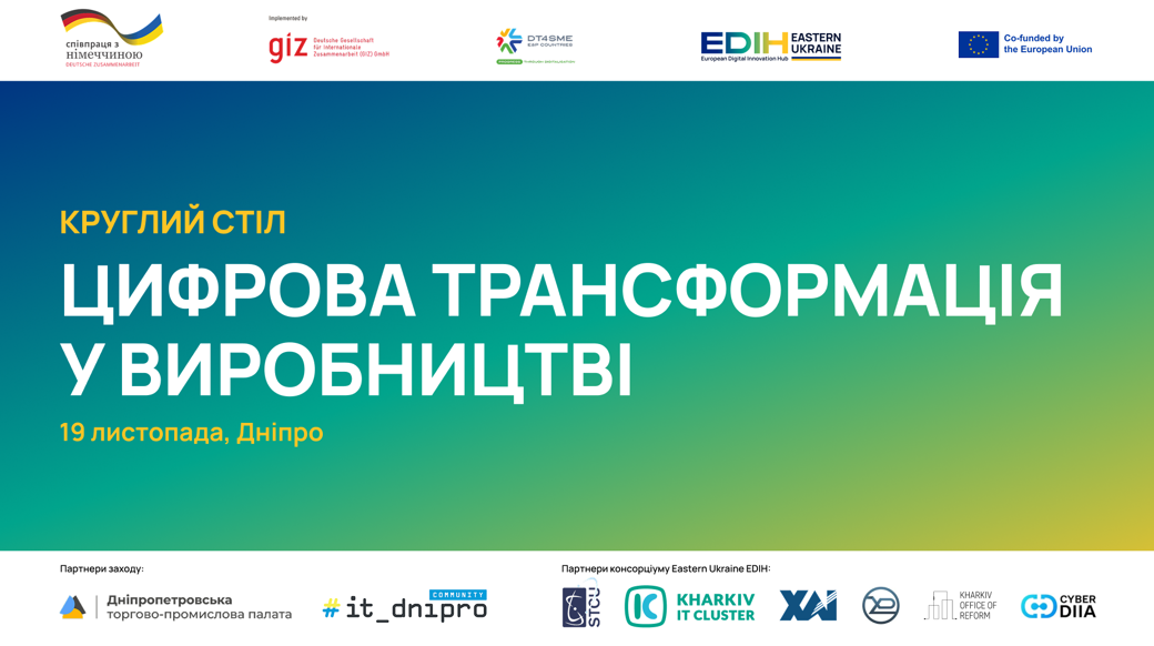 Eastern Ukraine EDIH спільно з Kharkiv IT Cluster, IT Dnipro Community та Дніпропетровською торгово-промисловою палатою запрошують керівників і представників малого та середнього бізнесу у сфері виробництва на модерований круглий стіл, що відбудеться 19 листопада у Дніпрі.