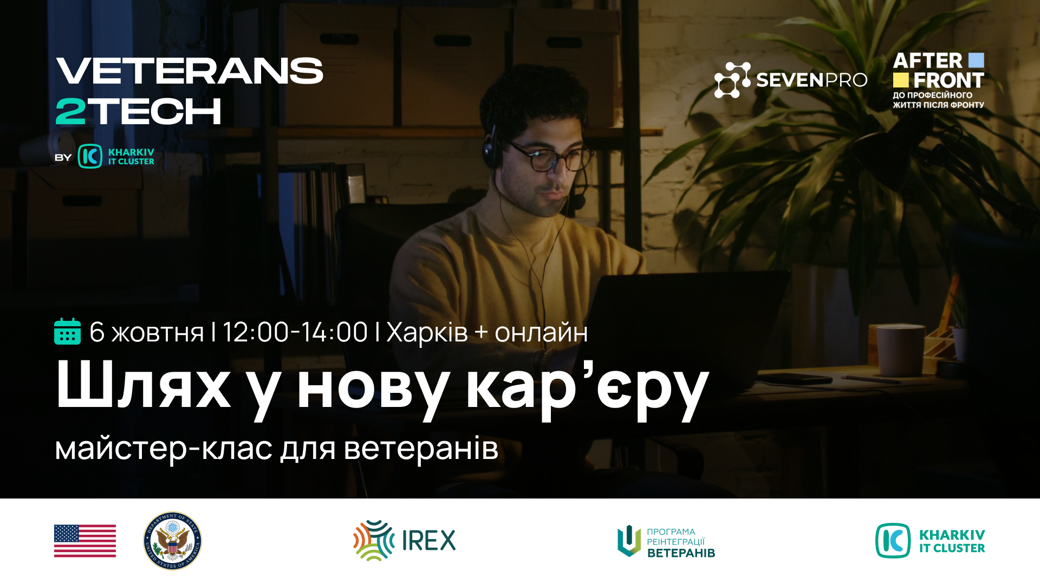 Це програма підтримки ветеранів і ветеранок на шляху в Tech, яка поєднує зустрічі з ветеранами-айтівцями, профорієнтацію та майстер-класи, навчання інструментам для працевлаштування, сесії для HR і керівників про адаптацію ветеранів у командах, а також Ярмарок можливостей з прямим контактом із роботодавцями.