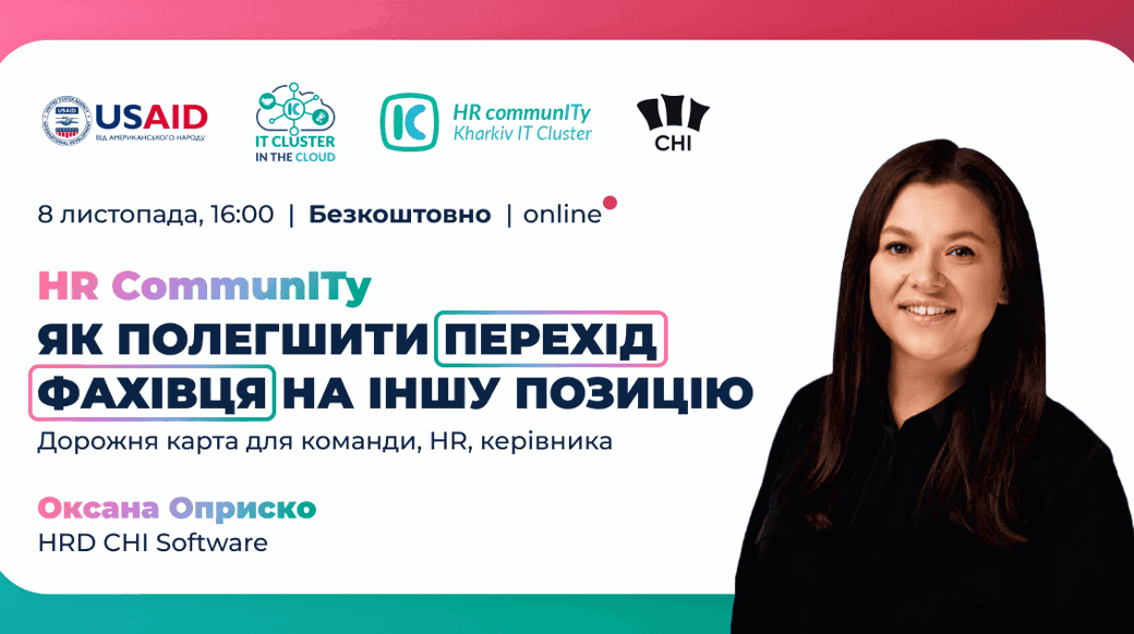 👉 Твій безкоштовний квиток на подію за посиланням після реєстрації. ℹ️ HR CommunITy реалізується Kharkiv IT Cluster за підтримки Програми USAID «Конкурентоспроможна економіка України».Як допомогти співробітнику в адаптації під час переходу на нову позицію (в середині компанії та у новій компанії)?