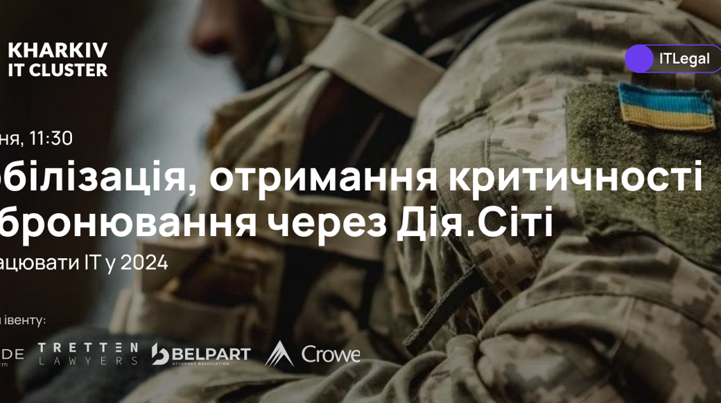 🎙 Анна Бєлолипецьких — керівна партнерка BELPART. 🎙 Лілія Бєлоус — адвокатка, партнерка BELPART. 🎙 Віталій Смердов — партнер Crowe Mikhailenko. 🎙 Андрій Духницький — партнер Crowe Mikhailenko. 🎙 Руслан Кім — адвокат, партнер Lexade. 🎙 Антон Клименко — старший юрист Tretten Lawyers. Модератор івенту: Ольга Шаповал — виконавча директорка Kharkiv IT Cluster. 💰 Вартість участі — 3990 грн. Зібрані гроші ми спрямуємо на перезапуск технічної освіти. Мембери Kharkiv IT Cluster мають знижку 100%, учасники IT Cluster in the Cloud — 10%. ⚡️ Розвивайте ІТ-бізнес впевнено з Kharkiv IT Cluster. Реєстрація — за посиланням.IT Legal від Kharkiv IT Cluster: Мобілізація, отримання критичності та бронювання через Дія.Сіті — як працювати IT у 2024?
