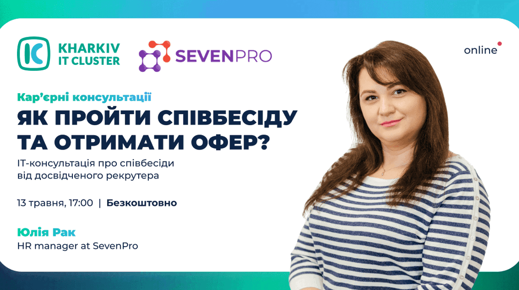 😅Відчуваєш, що готовий до старту роботи в ІТ галузі, але хотів би дізнатися більше деталей щодо процесу проходження співбесід? 📣Тоді саме для тебе Kharkiv IT Cluster та ІТ компанія SevenPro підготували неймовірну можливість — безоплатну кар’єрну консультацію з HR менеджером з ІТ! Коли? — 13 травня о 17:00, онлайн Спікер — Юлія Рак, HR Manager із компанії SevenPro🤔Чому захід буде корисним для тебе?