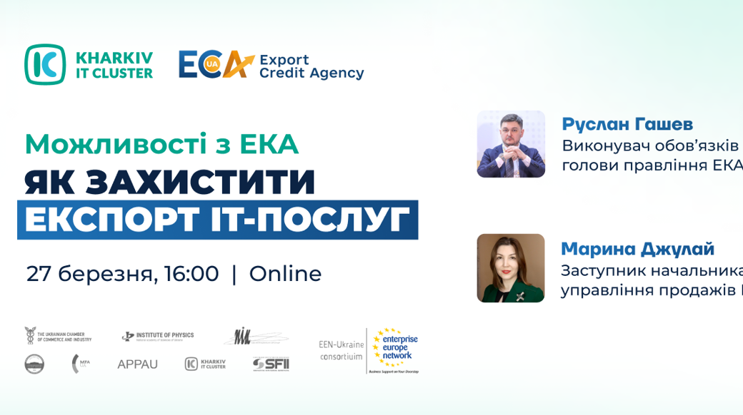 27 березня о 16:00 запрошуємо вас на вебінар від Експортно-кредитного агентства (ЕКА), на якому ви дізнаєтеся про фінансові інструменти підтримки експорту, що діють в Україні під час війни.