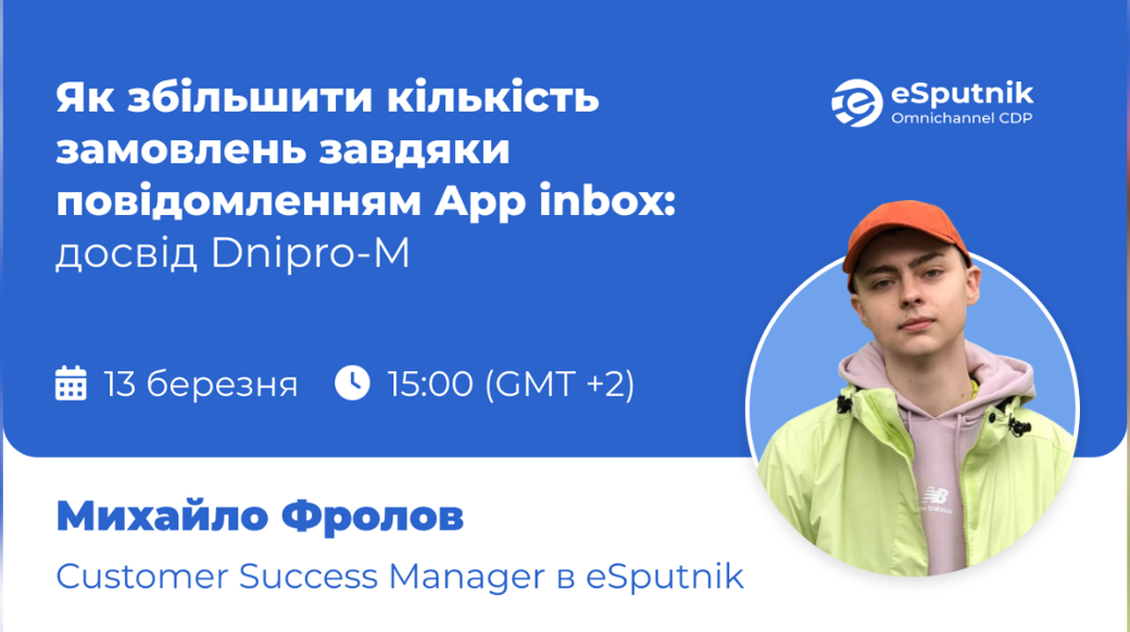 Запрошуємо на вебінар омніканальної CDP eSputnik на тему: «Як збільшити кількість замовлень завдяки повідомленням App inbox: досвід Dnipro-M».