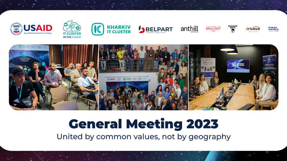 On September 8, 2023, the team and members of the Kharkiv IT Cluster gathered at the General Meeting 2023 simultaneously in Kharkiv, Kyiv, Lviv, and online. The meeting summarized the results of the first half of 2023 and discussed future plans.