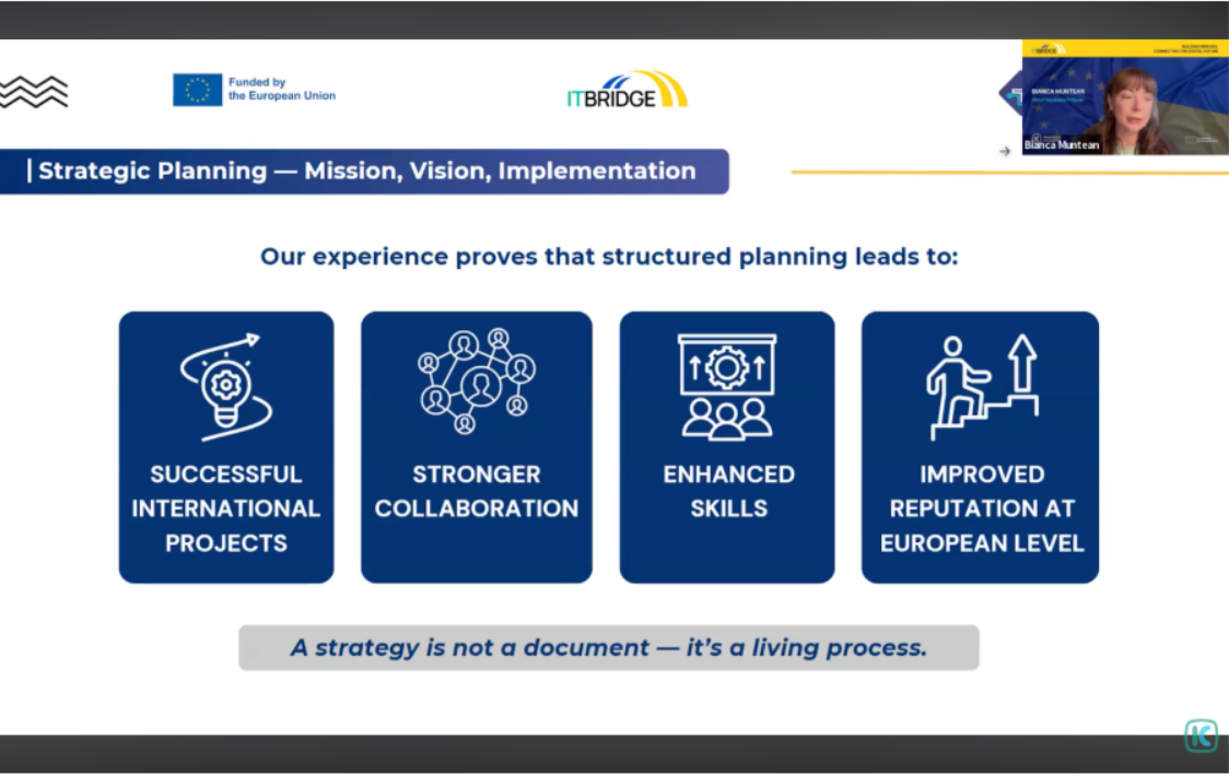 - Починайте з готовності: спочатку стратегія, потім дія. Розумійте потреби учасників, оцінюйте внутрішні ресурси, визначайте міжнародну ідентичність кластера та формуйте чіткий план дій.