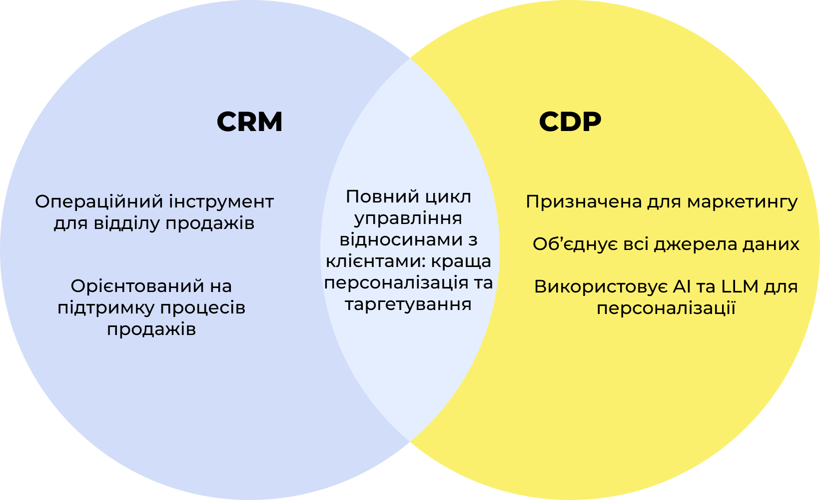 Як вирішити цю проблему? Бізнесу потрібна не просто база контактів, а система, що об’єднує дані з усіх каналів, дає можливість їх подальшого використання для персоналізації взаємодії та, в результаті, збільшує прибуток. Для цього існують два основні інструменти — CRM (Customer Relationship Management) і CDP (Customer Data Platform). Хоча вони мають спільну мету — допомагати краще розуміти клієнта, — принципи їхньої роботи відрізняються.
