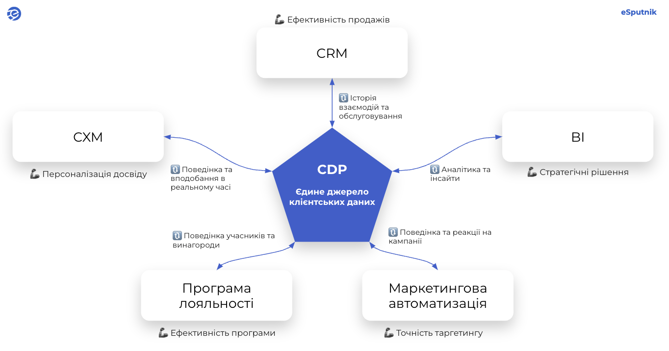 Для бізнесу CDP стає незамінною, коли база контактів перевищує 10 000: вона автоматизує реакції на дії клієнтів, зменшує відтік і стимулює повторні покупки через персональні пропозиції та крос-сейли. Дані з CDP можна передавати в інші системи.