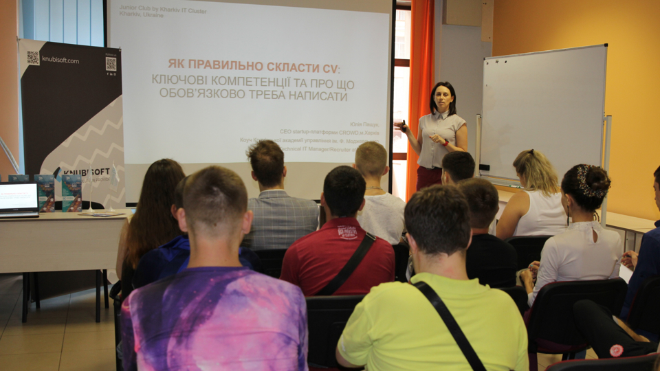 Про особливості складання резюме розповіла Юлія Пащук - СEO start-up платформи KH.CROWD, Learning consultant в Департаменті освіти ХМР, технічний експерт проекту Ampli, зараз - Technical IT Manager at Knubisoft. На воркшопі учасники клубу дізналися про факапах в CV, важливі hard skills і soft skills за різними напрямками та отримали приклад CV. Крім того, у наших джунів була можливість скласти невелике резюме на самому воркшоп і отримати feedback від рекрутерів. Також найсміливіші спробували пройти mock interview з представниками IT-компанії KHUBISOFT та отримали масу нових емоцій від отриманого досвіду.