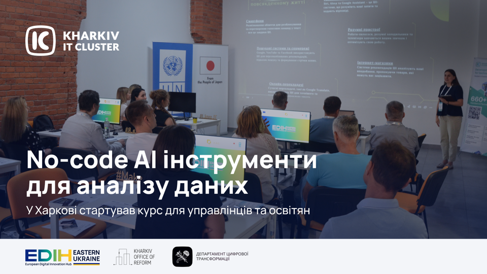 Саме тому Kharkiv IT Cluster та КУ «Офіс реформ Харкова» у партнерстві з Департаментом цифрової трансформації Харківської міської ради запустили безоплатний офлайн-курс «No-code AI інструменти для аналізу даних» для представників державного та освітнього секторів.