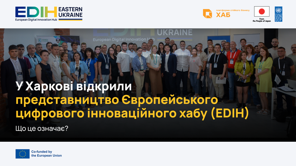 У Харкові за підтримки уряду Японії та ПРООН в Україні на базі хабу «Платформа стійкого бізнесу» відкрили офіс Європейського цифрового інноваційного хабу (EDIH) — це частина загальноєвропейської мережі цифрових хабів, яка охоплює сотні проєктів по всій Європі. За допомоги хабу бізнеси, громади й публічні організації зможуть отримати професійний супровід цифрової трансформації.
