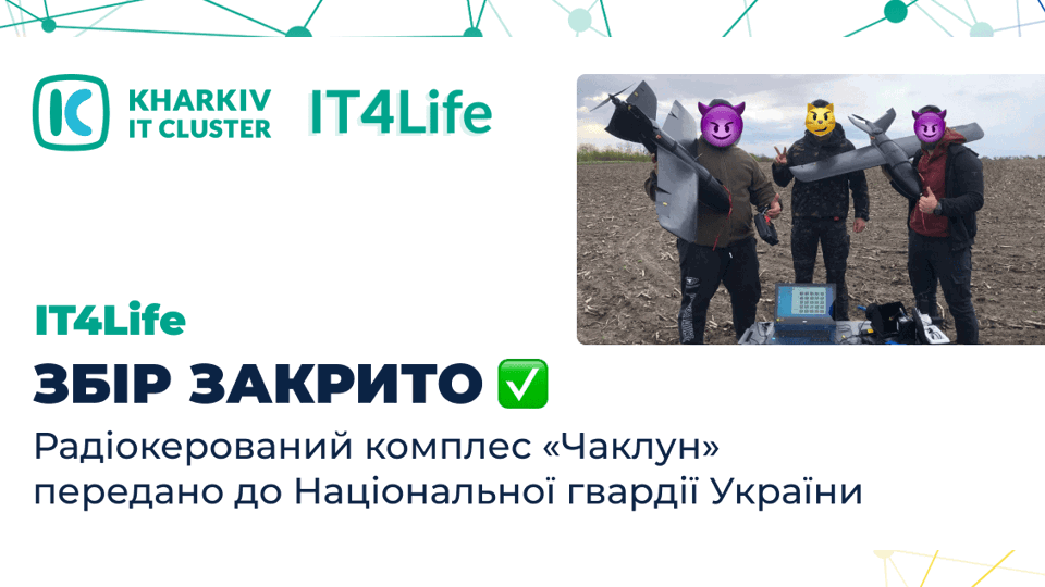 Раніше ми оголошували збір для купівлі «Валькірії» з метою допомоги військовим НГУ України. Після обговорень та за результатами збору військовими було прийнято рішення зупинитися на аналогу — радіокерованому комплексі «Чаклун». Для ефективного виявлення та знищення ворожих сил радіокерований комплекс «Чаклун» зможе виявляти ворожі цілі на відстані від 100 кілометрів. Трохи про нього тут. Вартість становила 450 000 гривень. Цю суму для придбання БПЛА «Валькірія» спільними зусиллями ми зібрали разом з вами! На сьогодні, хлопці вже пройшли навчання та опановують придбаний комплекс БПЛА та готуються до нових перемог! Kharkiv IT Cluster дякує кожному небайдужому, хто долучився до збору! Наближаємо перемогу разом!Підпишись на наш телеграм канал, щоб бути у курсі вступної кампанії 2023