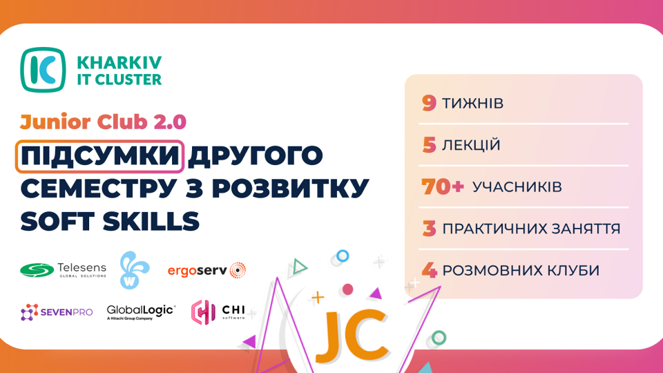 🌌 Проєктний менеджмент в IT від Юлії Тичинської, ErgoServ Вступ до методологій управління проектами й практичні поради щодо керування ними в IT-галузі 🌌 Практичне заняття зі складання резюме від Катерини Деребас, SevenPro Учасники шляхом аналізу власних резюме розібрали гарні й погані приклади ефективної самопрезентації. 🌌 ІТ-тренди й майбутнє технологій від Антона Мужайло, GlobalLogic Найсвіжіші й найперспективніші напрями на ринку ІТ-бізнесу. 🌌 Практичне заняття з проходження співбесіди від Марини Логвіної SevenPro Учасники отримали гайд зі співбесіди від професійного ІТ-рекрутера, а деякі з них спробували відповісти на типові питання нетехнічної співбесіди. 🌌 English Speaking club: Подкастинг від Олени Чехратової, CHI Software Слухання й обговорення англомовних подкастів, під час яких студенти зокрема отримали поради щодо корисних ресурсів для розвитку власних навичок англійської мови . Після завершення курсу найактивніші студенти, які успішно склали модульні тестування, отримали досвід менторства в профорієнтаційній грі Kids2IT та активно взяли участь у заняттях і практиках, отримали сертифікати 🌈 Kharkiv IT Cluster висловлює щиру подяку компаніям-учасникам за внесок у розвиток молоді! А ми запрошуємо тебе до наших соціальних мереж, щоб моніторити новини й не пропустити запуск наступного семестру 🍂 Освітні партнери-учасники, які долучилися до проєкту:- Харківський національний університет радіоелектроніки;