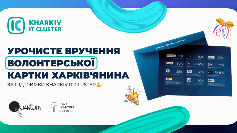 Урочиста церемонія вручення волонтерських карт харків'янам стала важливою подією для спільноти міста. Завдяки нашим спільним зусиллям система «Волонтерська картка харків’янина» отримала новий цифровий формат та власну діджиталізовану платформу. Kharkiv IT Cluster радий зробити свій внесок у розвиток міста і готовий далі децентралізувати наш Харків! Приєднуйтесь до прогресивного ком’юніті Kharkiv IT Cluster — ставайте частиною наших проєктів та отримуйте доступ до спеціальних пропозицій 🔥Читайте також