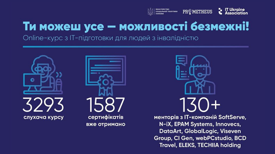 Асоціація «IT Ukraine» спільно з платформою онлайн-освіти Prometheus і Міністерством соціальної політики України реалізовують курс із онлайн-вивчення IT для людей з інвалідністю. Курс, що стартував 5 березня, називається «Ти можеш усе — можливості безмежні!». Навчальний етап уже завершився, і більшість студентів отримали сертифікати про проходження курсів. Це означає, що розпочинається найвідповідальніший для учасників етап — працевлаштування. Асоціація з радістю зазначає, що пілотний проєкт продемонстрував гарну мотивацію учасників до реалізації в IT-галузі. Про це свідчить кількість студентів із більш ніж 20 міст України, які пройшли курси й отримали сертифікати. Саме тому зараз асоціація шукає компанії, які готові посприяти працевлаштуванню слухачів курсу в будь-який зручний спосіб:- якщо ви маєте відкриті вакансії, на які може претендувати на конкурсній основі кандидат із інвалідністю;