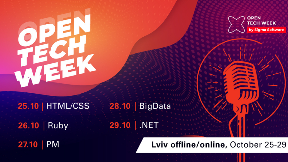 Open Tech Week — освітній проєкт, що поєднує в собі професійний розвиток, обмін знаннями, нетворкінг та благодійність. Проєкт започаткувала компанія Sigma Software в січні 2017 року з метою підтримки локальних ІТ спільнот в містах розташування великих офісів компанії. В 2020 році, після введення карантинних обмежень, проєкт вийшов в онлайн-формат і став доступний для всіх, хто прагне розвивати власні ІТ навички. Ще одна важлива складова проєкту Open Tech Week — допомога тим, хто цього потребує. Всі зібрані кошти з квитків ми передаємо на соціальні ініціативи в різних містах України. За 5 років існування проєкту ми провели 90 мітапів та передали на благодійність близько 620 тисяч гривень. Open Tech Week — це про живе спілкування, мотивуючих спікерів, надихаючі спічі, трендові напрямки та особливу атмосферу. Будемо раді бачити вас як слухачів і як спікерів, якщо вам є чим поділитись. Долучайтесь!Підпишись на наш телеграм канал, щоб бути у курсі вступної кампанії 2022