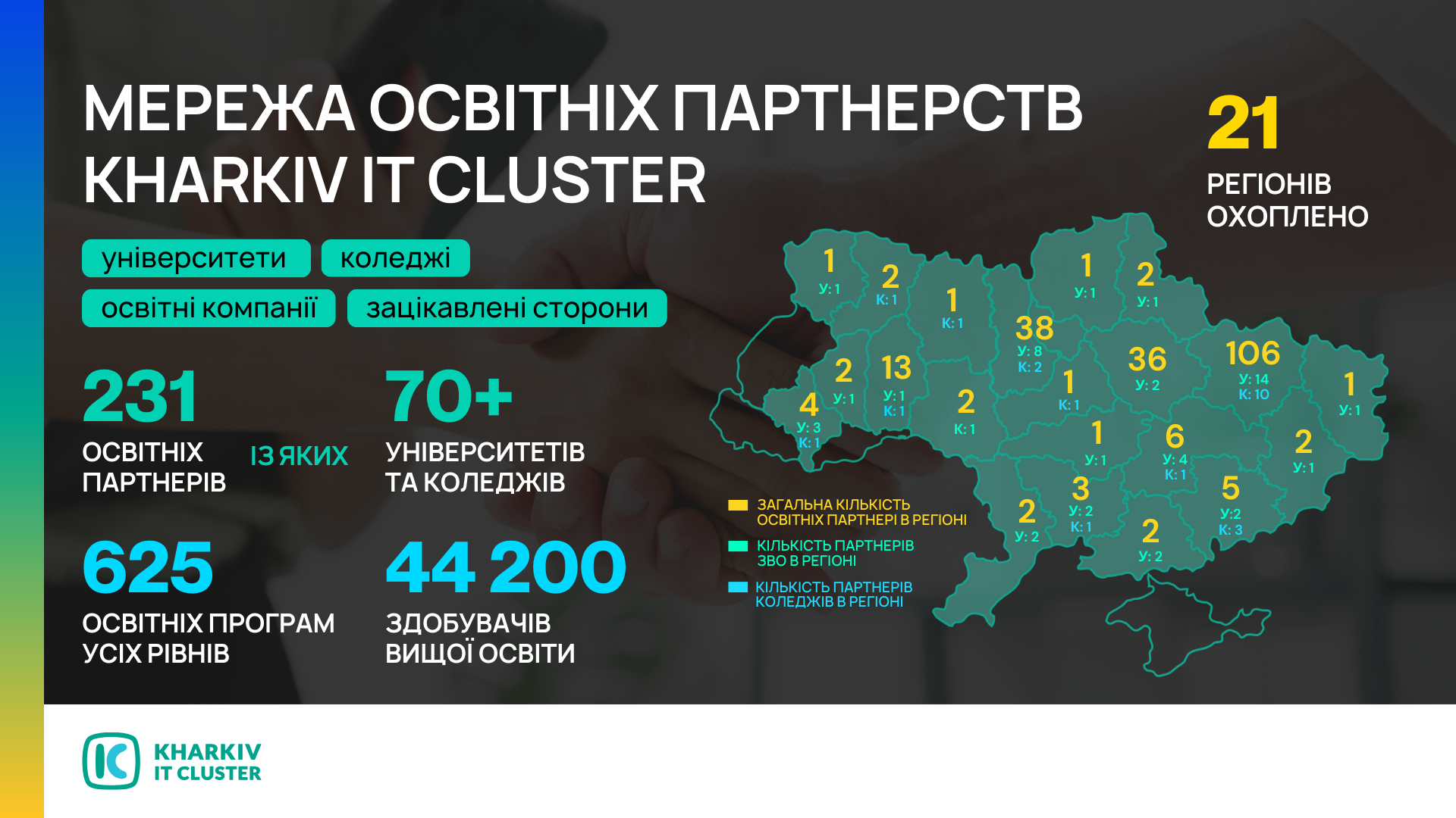 Візуалізація демонструє широкий вибір закладів освіти — партнерів Харківського ІТ Кластера, що представлені на Порталі — від сходу до заходу країни 👇