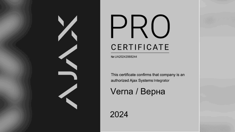 Кваліфікаційний сертифікат Ajax PRO — 2024 дає фахівцям VERNA можливість впроваджувати як бездротові рішення безпеки Ajax, так і
