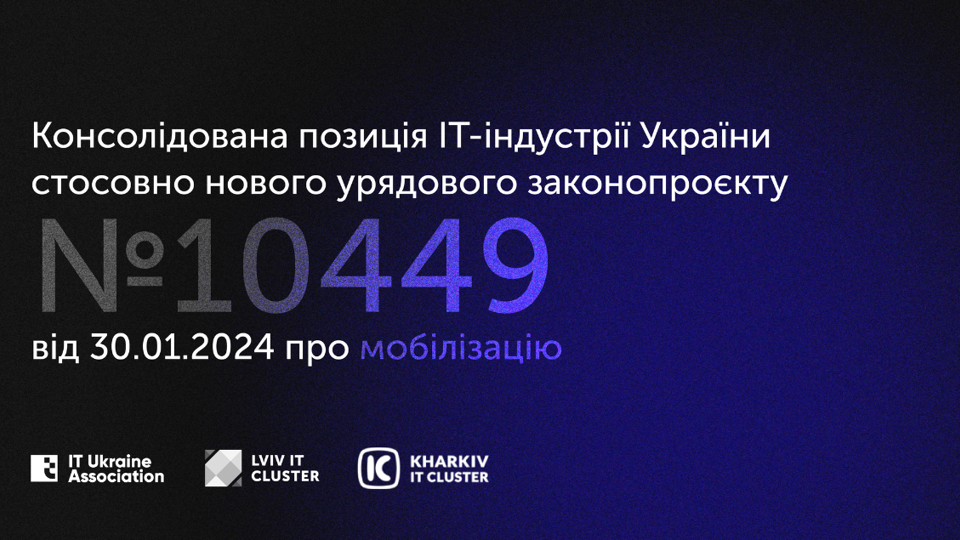 Асоціація IT Ukraine, Kharkiv IT Cluster та Lviv IT Cluster висловлюють консолідовану позицію ІТ-індустрії стосовно нового урядового законопроєкту №10449 від 30.01.2024 про мобілізацію. ІТ-об’єднання України розуміють мету проєктів Законів України щодо мобілізації та бронювання, ми підтримуємо прагнення до справедливості та намагання законодавчо вирішити низку проблем, що має наразі держава в сфері військових зобов’язань громадян, а саме військового обліку та проходження військової служби. 30 січня цього року у ВРУ було повторно внесено Урядовий проєкт Закону №10449, який пропонує вдосконалення законодавства щодо мобілізації. Найбільші ІТ-спільноти України, зокрема Асоціація IT Ukraine, Lviv IT Cluster, Kharkiv IT Cluster, неодноразово висловлювали позицію щодо незбалансованості законопроєкту №10378. Він викликав низку питань та, у разі прийняття, ставив під загрозу розвиток економіки, як однієї з важливих складових підтримки країни та війська, та розвиток бізнесу в Україні. Наразі бачимо, що текст законопроєкта №10449 фактично дублює попередній №10378 та жодним чином не вирішує нагальних питань. Навпаки, ускладнює функціонування бізнесу та ситуацію загалом, створюючи напругу між бізнес-середовищем, суспільством і державними інституціями. Ризики, що залишаються в законопроєкті, є критичними для ІТ-галузі. На жаль, влада не використала час для діалогу з індустрією та суспільством і не вирішила проблемні питання. Так, критичними залишаються:
