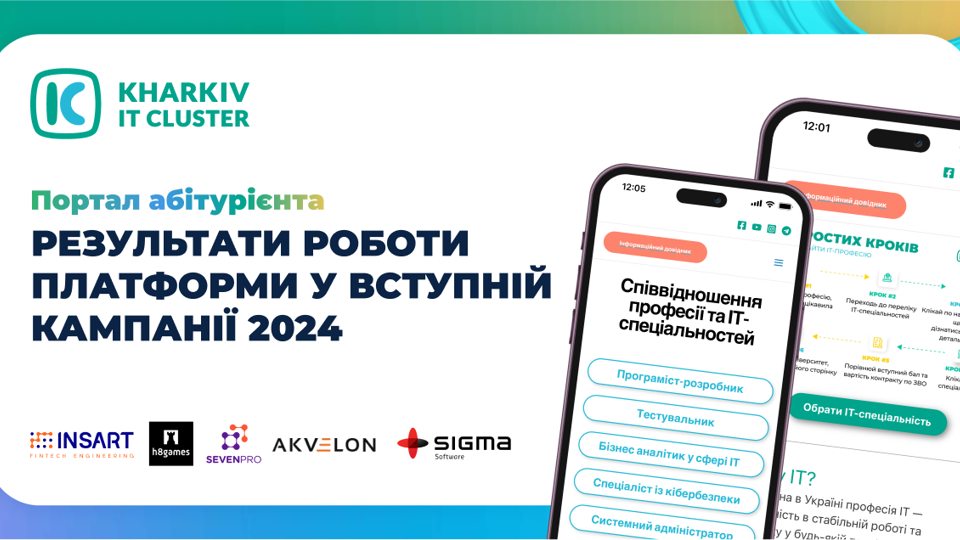 ✅ З березня 2024 року на сервісі було зареєстровано більше ніж 8+ мільйонів переглядів; ✅ кількість переходів на Портал ІТ-абітурієнта за період маркетингової кампанії досягла 87 тисяч; ✅ кількість унікальних глядачів на Порталі ІТ-абітурієнта за період маркетингової кампанії досягла 2 мільйони; ✅ зібрано 23 університети та 23 спеціальності; Команда Kharkiv IT Cluster щиро дякує Insart, h8games, SevenPro, Akvelon i Sigma Software за підтримку проєкту й продовжує працювати над платформою, щоб кожного року кількість успішних ІТ-абітурієнтів тільки зростала!Довідка: