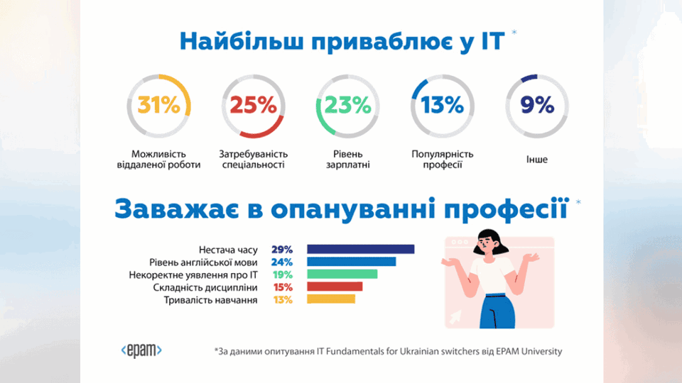 Особливо на IT-професії почали звертати увагу ті, хто втратив роботу чи змінив місце проживання. Можливість працювати віддалено приваблює кожного третього українця, котрий вирішив спробувати свої сили в IT. Про це свідчать результати опитування студентів IT-компанії EPAM. Чверть респондентів зазначає, що для них також важлива затребуваність професії, а для 23% опитаних - рівень заробітної плати.