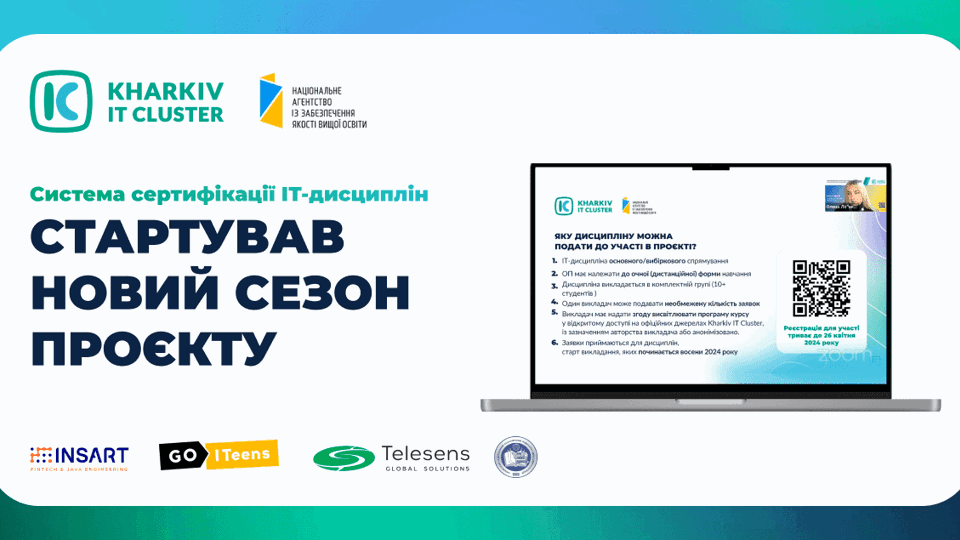 Учасникам презентували оновлення проєкту й оголосили дедлайни й умови приймання заявок на участь у рецензуванні дисциплін. «Ініціатива та ідеологія проєкту пішла не з бізнесу, а з освітянської спільноти й ми щиро раді, що змогли знайти правильні підходи для реалізації проєкту», — зазначила Ольга Шаповал, виконавча директорка Харківського ІТ Кластера. Також до заходу долучився Олександр Хименко — керівник секретаріату Національного агентства із забезпечення якості вищої освіти, який наголосив на важливості проєкту та його впливі на розвиток сучасної ІТ-освіти, зокрема зазначив, що сучасна освіта має бути не лише практикоорієнтовною, але й студентоцентрованою, щоб забезпечувати не лише потреби роботодавця, але й студента й університету. Ірина Золотарьова, член освітньої експертної групи, професор кафедри інформаційних систем Харківського національного університету ім. Семена Кузнеця, помічник ректора з міжнародних проєктів, член НАЗЯВО, член національної команди експертів з реформування вищої освіти ЕРАЗМУС+, подякувала компаніям, які постійно долучаються до роботи над проєктом. «Я дякую Харківському ІТ Кластеру й усім, хто долучений до проєкту. Харківський ІТ Кластер — це активне, прогресивне й відкрите середовище, яке надихає та підтримує як школярів, так і студентів і викладачів — кількість активностей неймовірна й постійно зростає, що позитивно впливає на розвиток освіти в Україні», — наголосила пані Ірина Золотарьова. Від бізнес-спільноти викладачів привітали Михайло Солощук, президент компанії INSART та Олеся Ульянова, СЕО TELESENS, ментор USAID, які зазначили, що раді, що пропри все проєкт «Система сертифікації ІТ-дисциплін» працює і стартує з новою силою. Окрім цього, наголосили про його важливість не лише для освітянської спільноти, але й для бізнесу і заявили про готовність сприяти розвитку проєкту й долучатися до рецензування. Більш детально про участь у новому проєкту дізнавайтеся за посиланням на YouTube 👉 https://youtube.com/live/ktd_qJDv18w?feature=share 🔥Запрошуємо викладачів подавати заявки на участь у проєкті «Система сертифікації ІТ-дисциплін» задля рецензування силабусів експертами з ІТ-компаній.Як узяти участь?