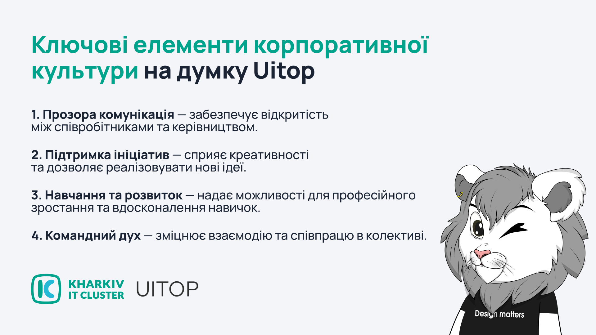 Утримання талановитих дизайнерів — це справжній челендж для сучасних компаній. Uitop, компанія-мембер Kharkiv IT Cluster, яка спеціалізується на UX/UI дизайні, бачить корпоративну культуру як ключовий фактор для залучення та збереження провідних фахівців.