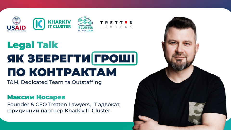 Другою важливою темою обговорення була відмінність Dedicated Team від T&M та ризики, пов'язані з Outstaffing. Dedicated Team — це команда фахівців, яку наймає замовник для виконання конкретного проєкту або процесу. У порівнянні з T&M, де контроль над розробкою залишається на боці замовника, у Dedicated Team замовник отримує готовий продукт, виконаний командою. Зате у моделі Outstaffing замовник наймає фахівців з зовнішньої компанії, що може створити додаткові ризики пов'язані з нестачею контролю та комунікації. У контексті всіх трьох моделей було виокремлено практичні заходи захисту від фінансових ризиків. Більше деталей у записі вебінару на нашому каналі YouTube. Ефективне укладання контрактів T&M, Dedicated Team та Outstaffing є важливим для успішної реалізації проєктів та уникнення фінансових ризиків. Саме практичні кейси, розібрані на івенті «Фішки ІТ-контракту з клієнтом, які дозволять заробляти більше», дали можливість переглянути вже наявні ІТ-контракти та передбачити ризики по майбутніх. А це означає — захистити діяльність ІТ-компаній у правовому полі та посилити спроможність до економічного зростання. Kharkiv IT Cluster, як динамічна та впливова спільнота, продовжує працювати задля розвитку української ІТ-індустрії та створення екосистеми для технологічного бізнесу. Захід, реалізований завдяки підтримці Програми USAID «Конкурентоспроможна економіка України», став практичною платформою, де попри географічну приналежність ІТ-компанії долучились до експертного обміну досвідом та отримали практичні поради для свого бізнесу. Ми щиро вдячні Максиму Носареву за його професійну експертизу та шерінг яскравими кейсами з багаторічного досвіду Tretten Lawyers. Висловлюємо подяку компаніям Odesa IT-family, SocialBoost, IT Ukraine Association, Tucha, Ivano-Frankivsk IT-Cluster, Happy Monday та UGEN за їхню підтримку в інформаційному просторі, завдяки якій наша подія стала корисною для широкої аудиторії ІТ-компаній.