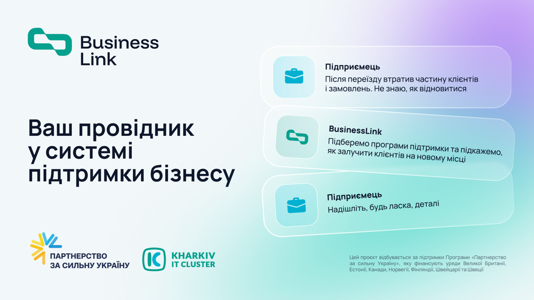 BusinessLink — проєкт-навігатор від Kharkiv IT Cluster, створений для того, щоб з'єднати бізнес із системою підтримки, яка вже працює. Ми не дублюємо існуючі сервіси — ми робимо їх доступними. Проєкт діє у Харківській, Сумській, Дніпропетровській та Запорізькій областях.